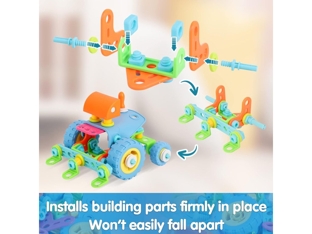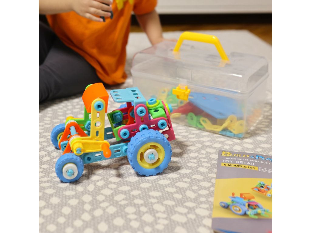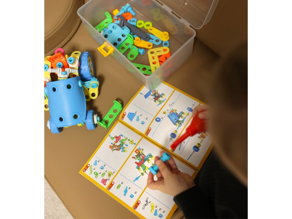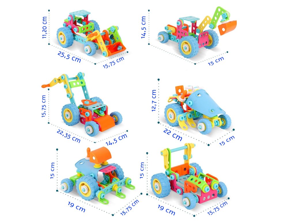 - Súprava obsahuje: Rôzne tvarované tehličky, skrutkovač a kľúč, upevňovacie skrutky s maticami, kolesá, obrázkový návod na zostavenie 6 rôznych vozidiel