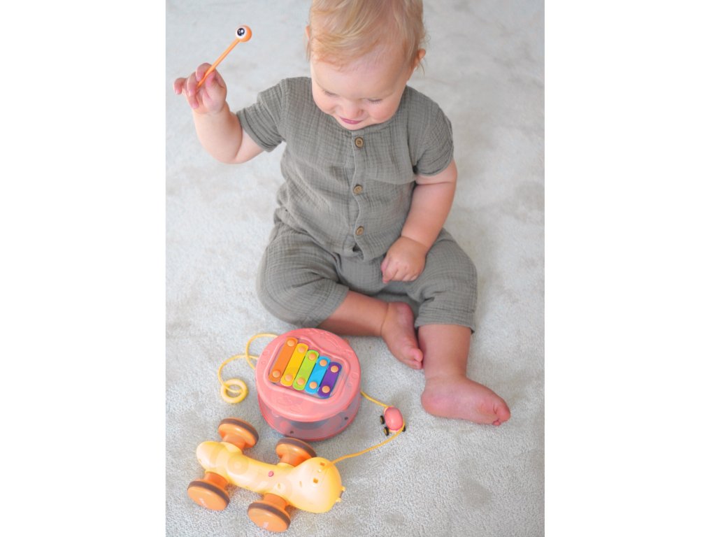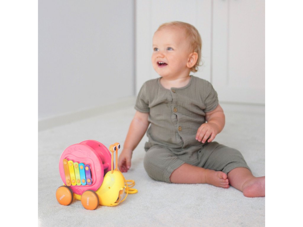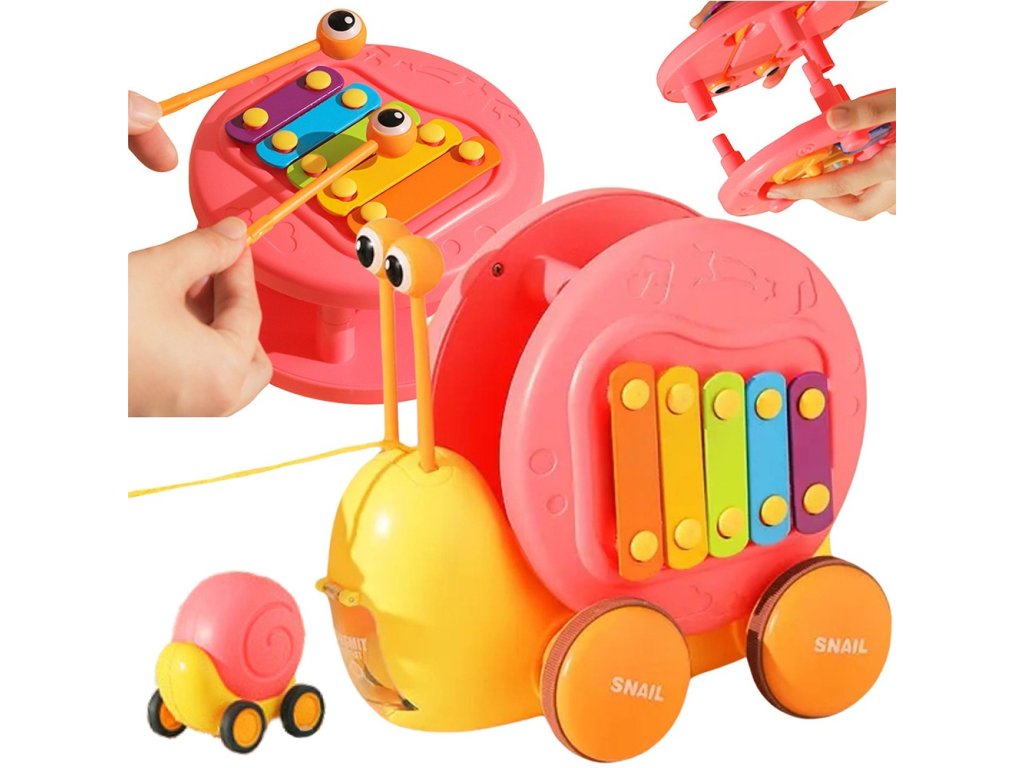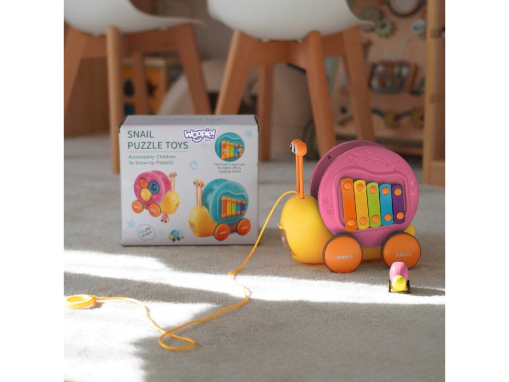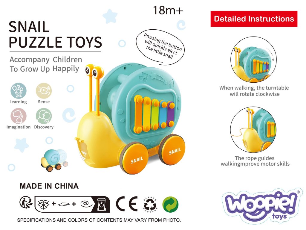 Multifunkčná hračka na tlačenie slimákov od značkyWOOPIE čo priťahuje pozornosť detí a podnecuje ich predstavivosť. Jasné farby tiež zlepšujú ich vizuálne vnímanie a estetické cítenie. Hračka na ťahanie slimáka poskytuje rôzne spôsoby hry a učenia. Môžetedopad wkľúče trénovať sluch a koordináciu detívizuálne-motor. Slimáka môžete tiež ťahať na vodítku alebo ho tlačiť a nechať ho kĺzať po podlahe, čo zvyšuje zábavu a náročnosť hry.Počas hry sa deti naučia niečo o zvieratách,hudba a vzťahy príčiny a následku. Podporujte pozorovanie, zručnostilogické myslenie ikoordinácia fyzickýzatiaľ čo vaše dieťa si užije hodiny tvorivej hry. Hračka na ťahanie slimáka je skvelý spôsob, ako sa s deťmi podeliť o šťastné chvíle. Mamičky sa môžu hrať so svojimi najmenšími a sledovať, ako sa chichocú, keď sa slimák pohybuje. Táto hračka je vhodná na rodinnú interakciu a môžeposilniť vzájomnápocity. Hračka sa skladá z dvoch častí: ulity slimáka, ktorá obsahuje činely, a činelových paličiek v tvare oka (umiestnených vo vnútri ulity). Druhou časťou je vystreľovač malého autíčka z tela slimáka - na zadnej strane hračky sa nachádza tlačidlo, ktoré otvára vystreľovač autíčka.