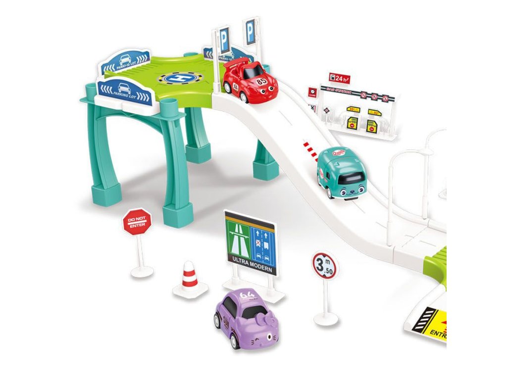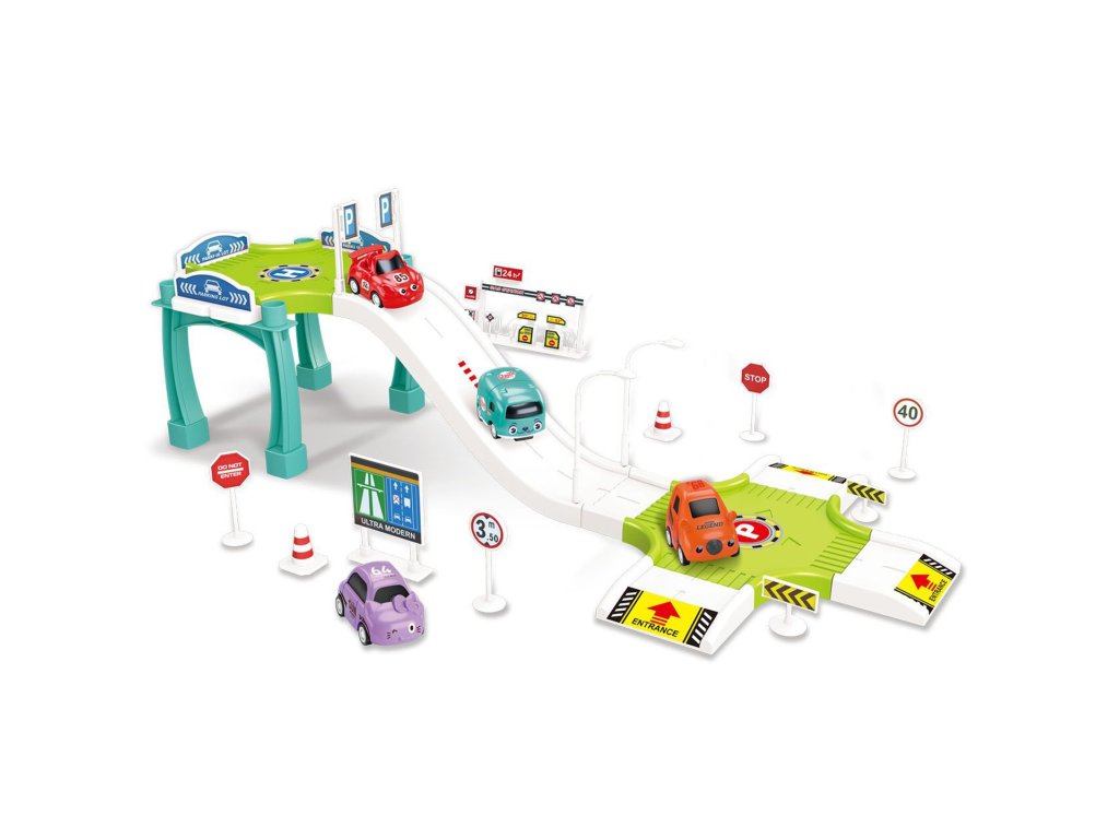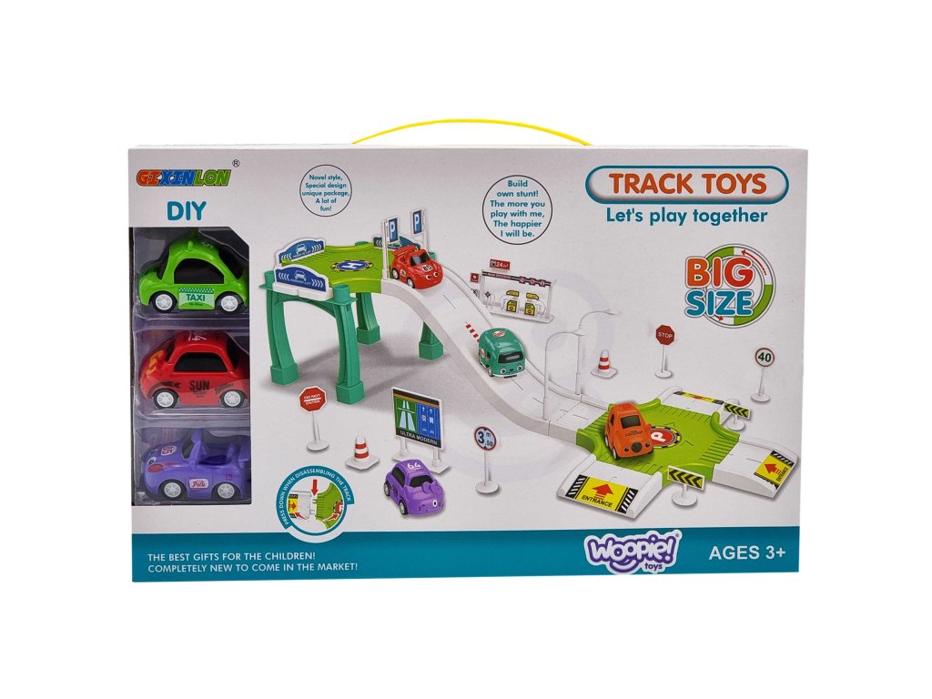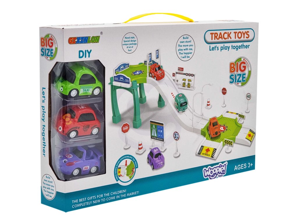 WOOPIE Trať Parkovisko Garáž Set Čerpacia stanica Cestné značky + 3 autá