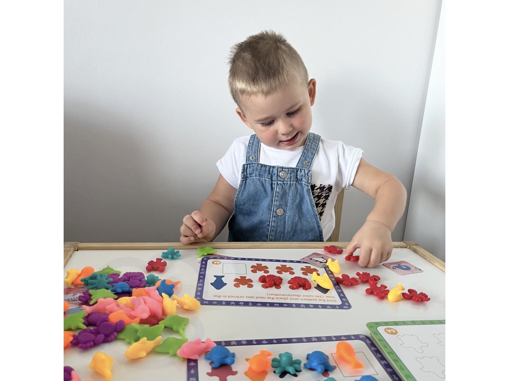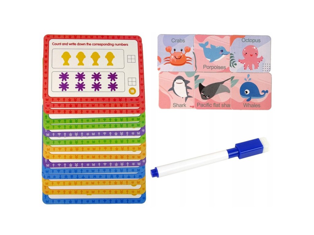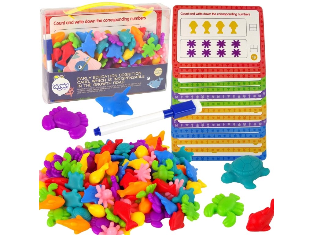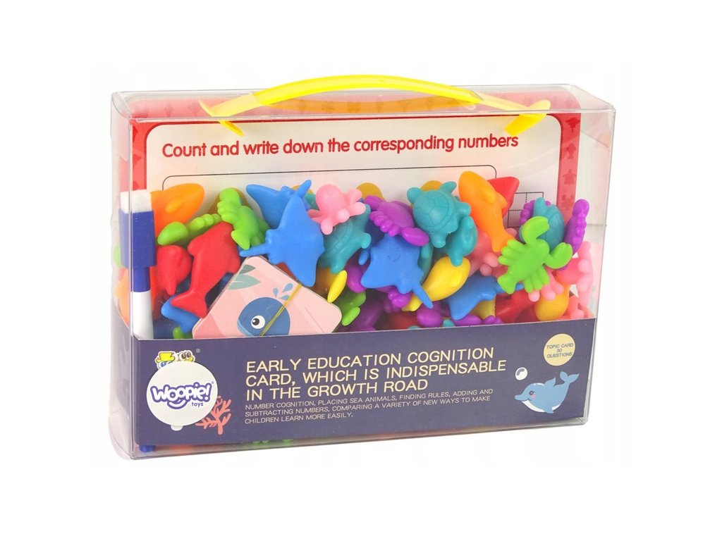 Súprava na vzdelávanieNámorná krajina od značkyWOOPIE je jednoduchou, ale účinnou pomôckou pri učení a hre.Hra pozostáva z na stránke matematické cvičenie s kartičkou s vetami pomocou číslic a fixky.Príklad úloha okrem iného: nájsť vzor a umiestniť naň príslušné zviera, spočítať nakreslené morské živočíchy a napísať ich na určené miesto atď. Okrem toho má hračka mnohovzdelávacie príležitosti používa. Za hranicamiučenie sa počítať, figúrky možno použiť aj navedy farby. Hračka rastie spolu s dieťaťom, pretože sa môže používať na výučbu jazyka v neskoršom období dospievania. Súprava je super alternatívou k štandardnému spôsobu výučby -učenie hrou!