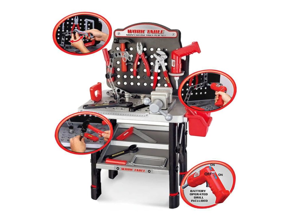 Bohato vybavené Dielenský stôl od spoločnosti WOOPIE je ideálny pre každého malého mechanika! Umožňuje učiť sa už od útleho veku, ako používať stavebné náradie a ako funguje. Dielnička poskytne vášmu dieťaťu skvelú zábavu a zároveň ho naučí samostatnosti a poriadkumilovnosti.Robustné spracovanie a materiály bezpečné pre deti. Hračkarozvíja kreativitu a stimuluje predstavivosť batoľaťa arozvíja svoje motorické zručnosti. Sada obsahuje náradie, ktoré potrebuje každý malý kutil - vrátane vŕtačky na batérie, kladiva, píly, zveráka, skrutkovača, skrutiek a ďalších. Súprava obsahujeaž 50 prvkov!