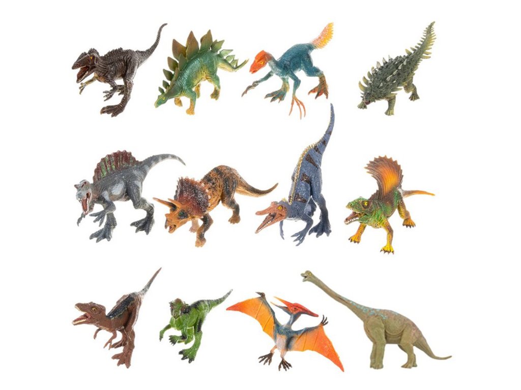 - 12 figúrok dinosaurov - Tyranosaurus Rex, Ankylosaurus, Dilophosaurus, Triceratops, Lesotosaurus, Brontosaurus, 2x Spinosaurus, Tarbosaurus, Iguanodon, Pieranodon