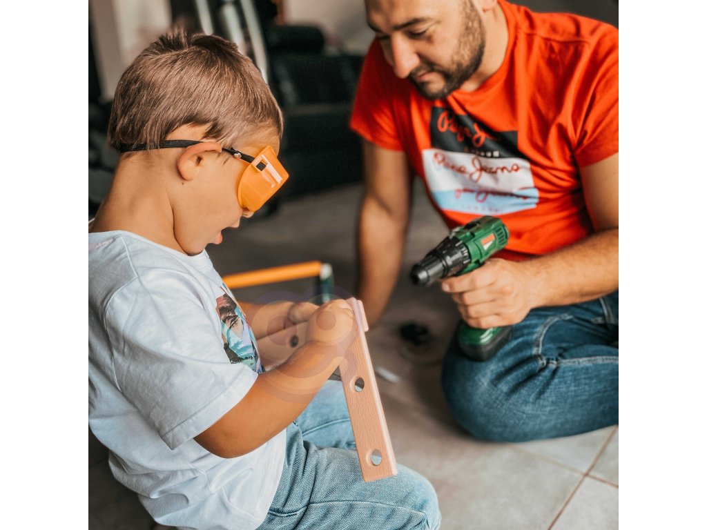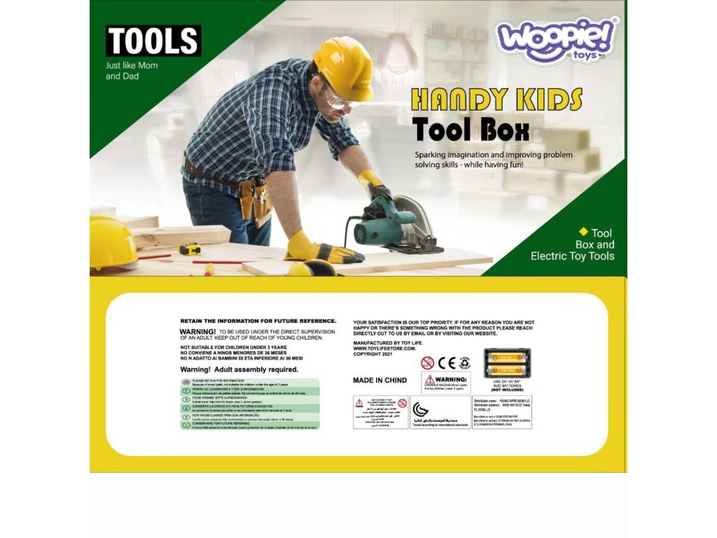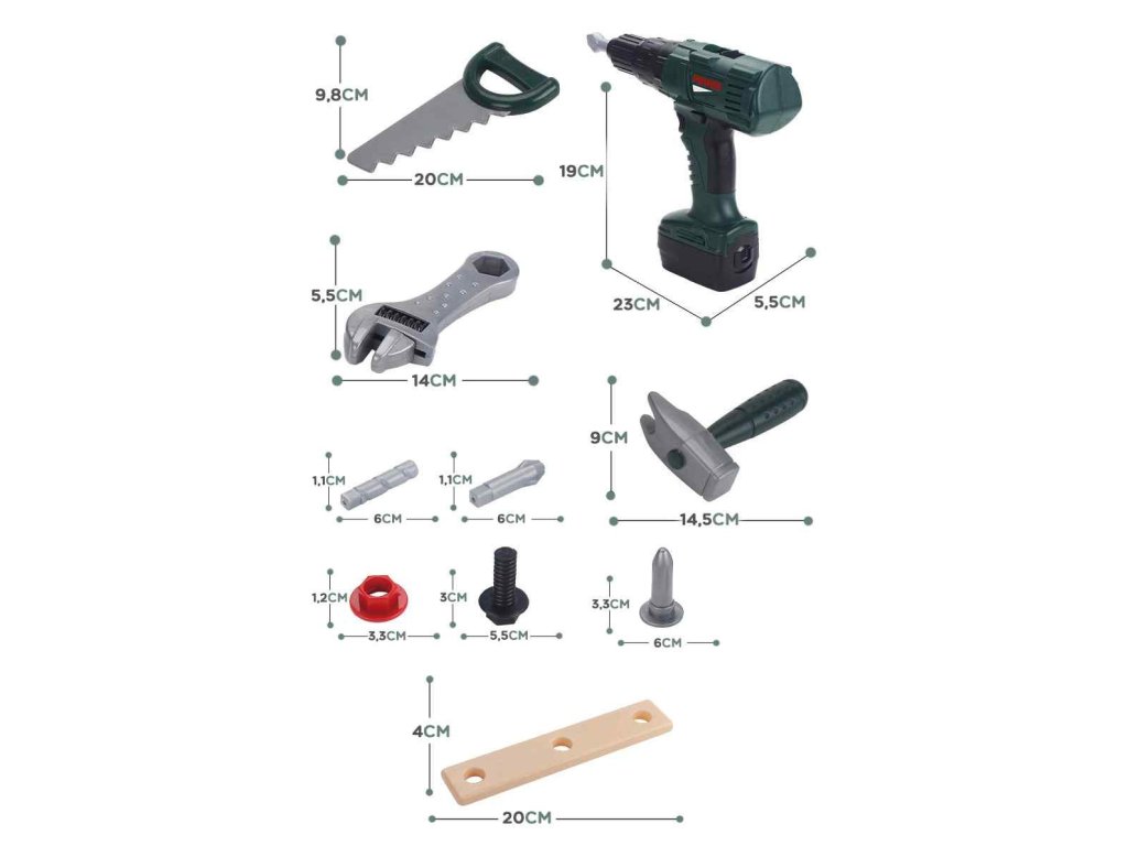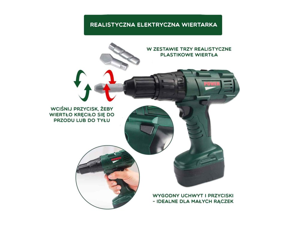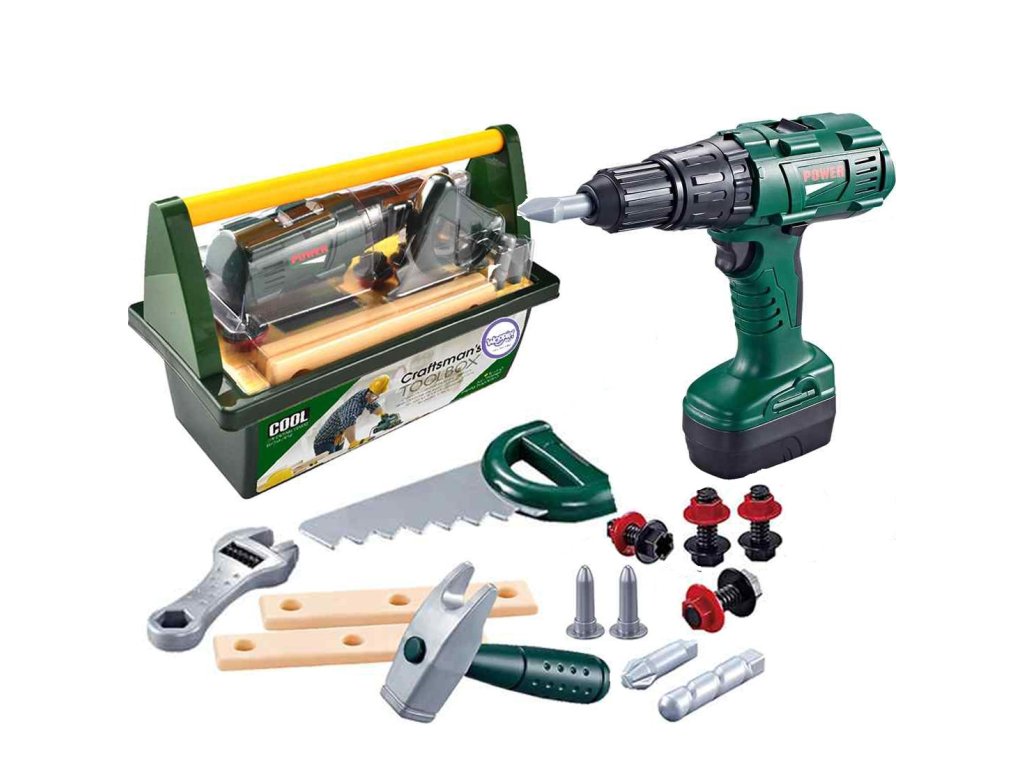 Skrinka na náradie so skrutkovačom a vŕtačkou vytvorila obľúbená spoločnosť pre deti WOOPIE. Súprava obsahuje tmavozelená, priestranná skrinka na náradie z pohodlné,žltá rukoväť a 15 prvkov. Medzi nástrojmi deti nájdu akumulátorový skrutkovač napájané batériou s 3 vymeniteľné hroty. Skrutkovač napodobňuje skutočný stroj vďaka zvuky a rotujúca skrutka. Okrem toho súprava obsahuje píla s pohodlnou rukoväťou, kladivo, kľúč, dve plastové dosky s otvormi na skrutkovač (vrátane 4) alebo pribíjanie (2 vrátane). Táto súprava poskytne skvelú zábavu každému malému majstrovi a zároveň pomáha rozvíjať manuálne zručnosti.