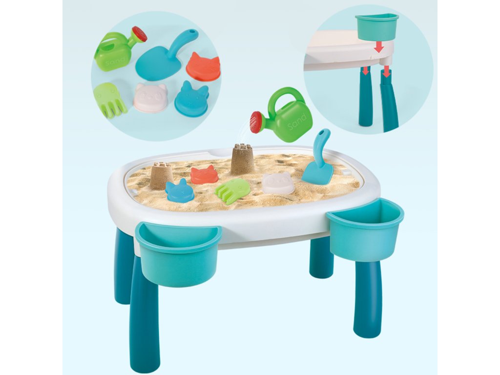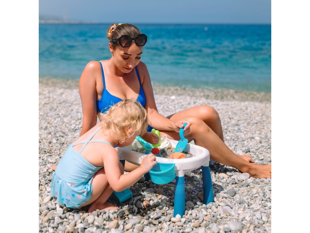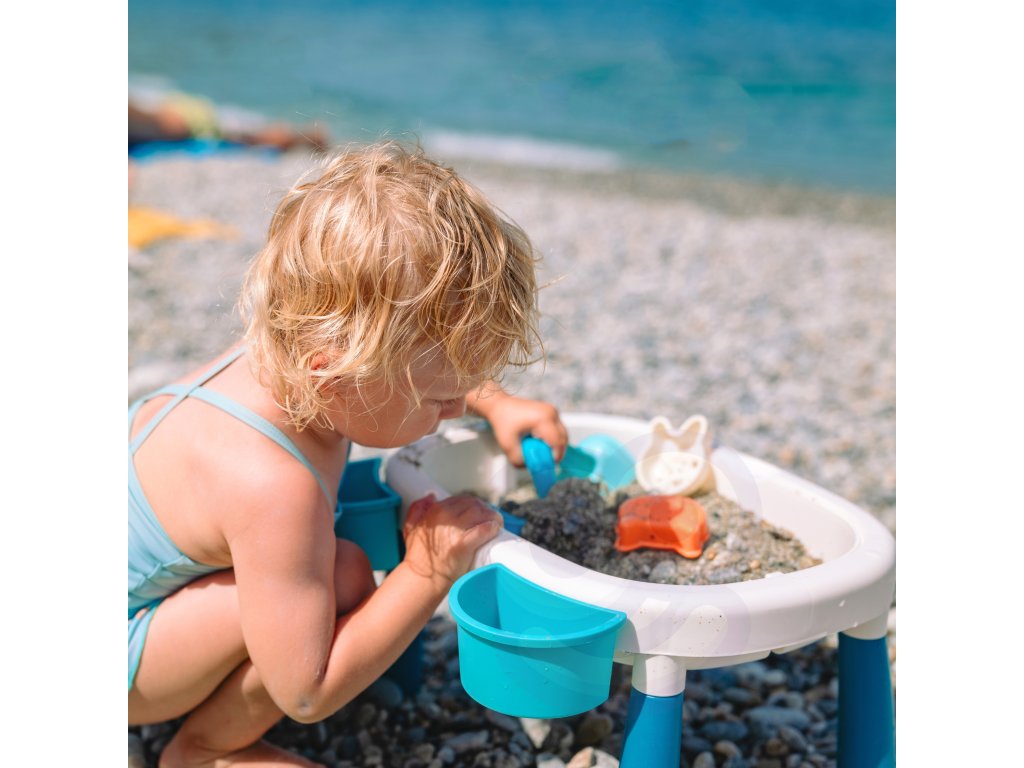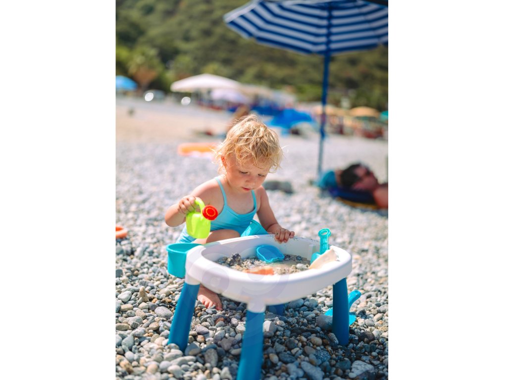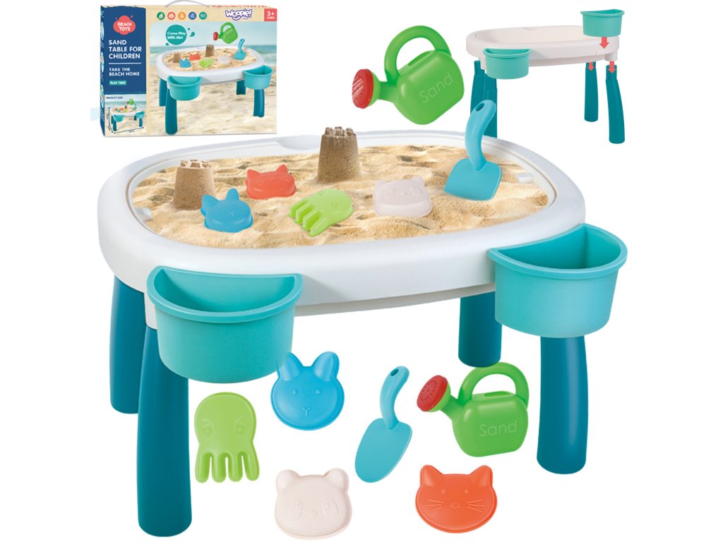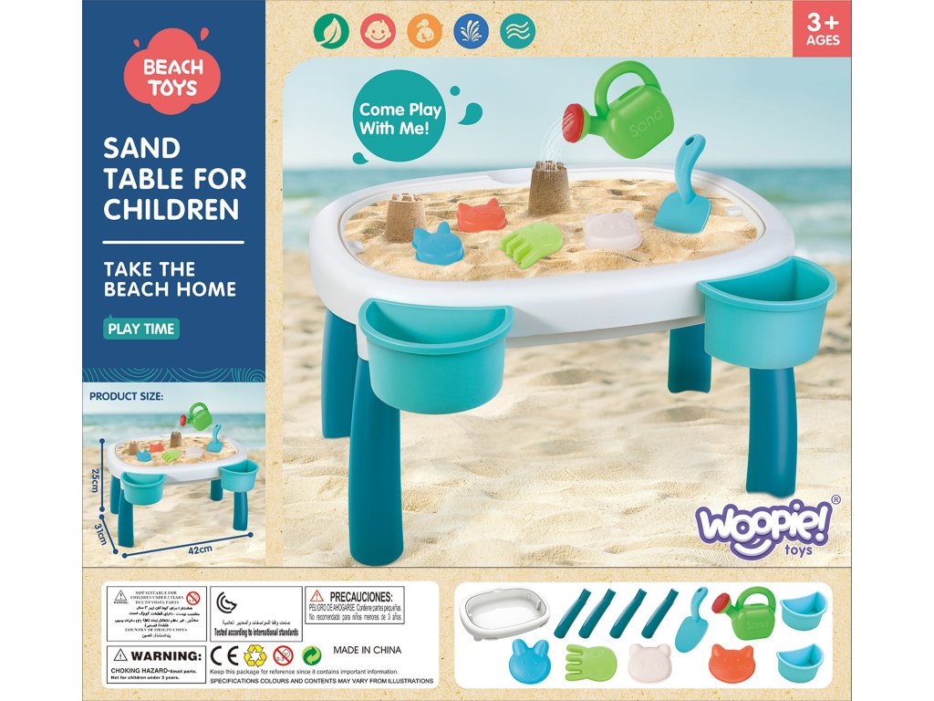 Stôl s pieskomod značky WOOPIE je ideálnou hračkou na hranie voda i piesok. Súprava obsahuje7 el:stôl s výsuvnými nohami a 2 zásobníkmi, 4 formy (chobotnica, mačka, panda a zajac), kanva na polievanie a lopata. Súprava je navrhnutá hrať wdomov a na pláži alebo na pieskovom brehu.