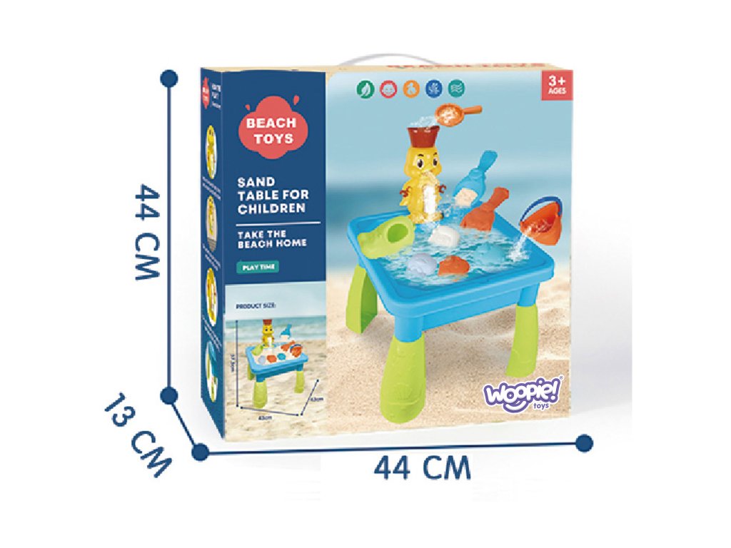 Stôl s pieskom od značkyWOOPIE je ideálnou hračkou na hranies vodou a pieskom. Súprava obsahuje9 príslušenstvo: lopata, hrable, vedro, formy,kačica s navijakom a mnoho ďalších. Keď sa do hlavy naleje voda, z kačice vytečie prúd, ktorý dáva efekt vodopádučo určite spríjemní hranie každému malému dieťaťu. Kačicu možno oddeliť od stola a pripevniť na stenu alebo vaňu v kúpeľni pomocouprísavky. Okrem toho má kačicarukoväte na stránke kefa na zubytak, aby sa dala pripevniť na umývadlo presne podľa výšky dieťaťa. Súprava je určená na hraniev interiéri a exteriéri. Ideálne na hranie doma, na pláži alebo na pieskovisku.