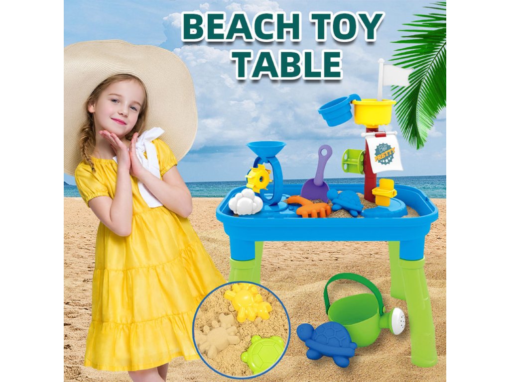 Stôl s pieskom od značkyWOOPIE je ideálnou hračkou na hranies vodou a pieskom. Súprava obsahujemnožstvo doplnkov na hranie, vrátane formičiek, hrablí, lopaty a mnohých ďalších. Pomocou pohára môže dieťa naliať vodu do stožiara a sledovať, ako sa voda pohybuje po vodných mlynoch. Stôl je navrhnutýna hranie v interiéri aj exteriéri. Ideálne na hranie doma, na pláži alebo na pieskovisku.