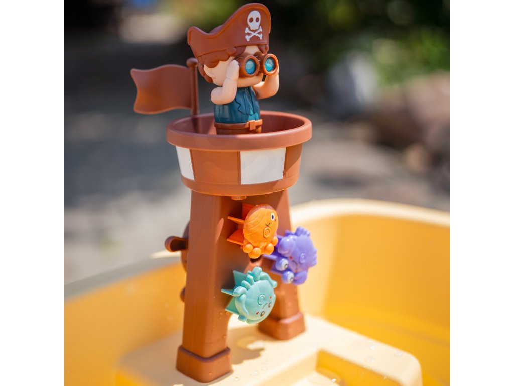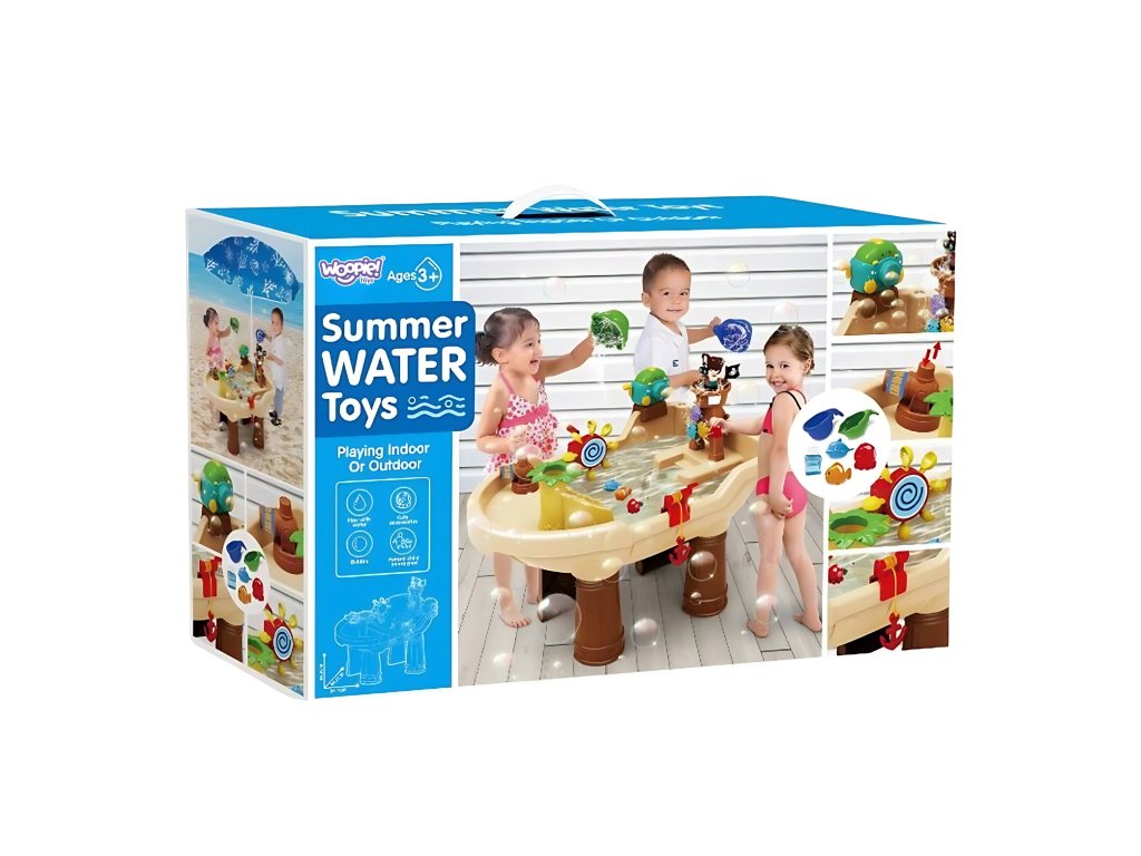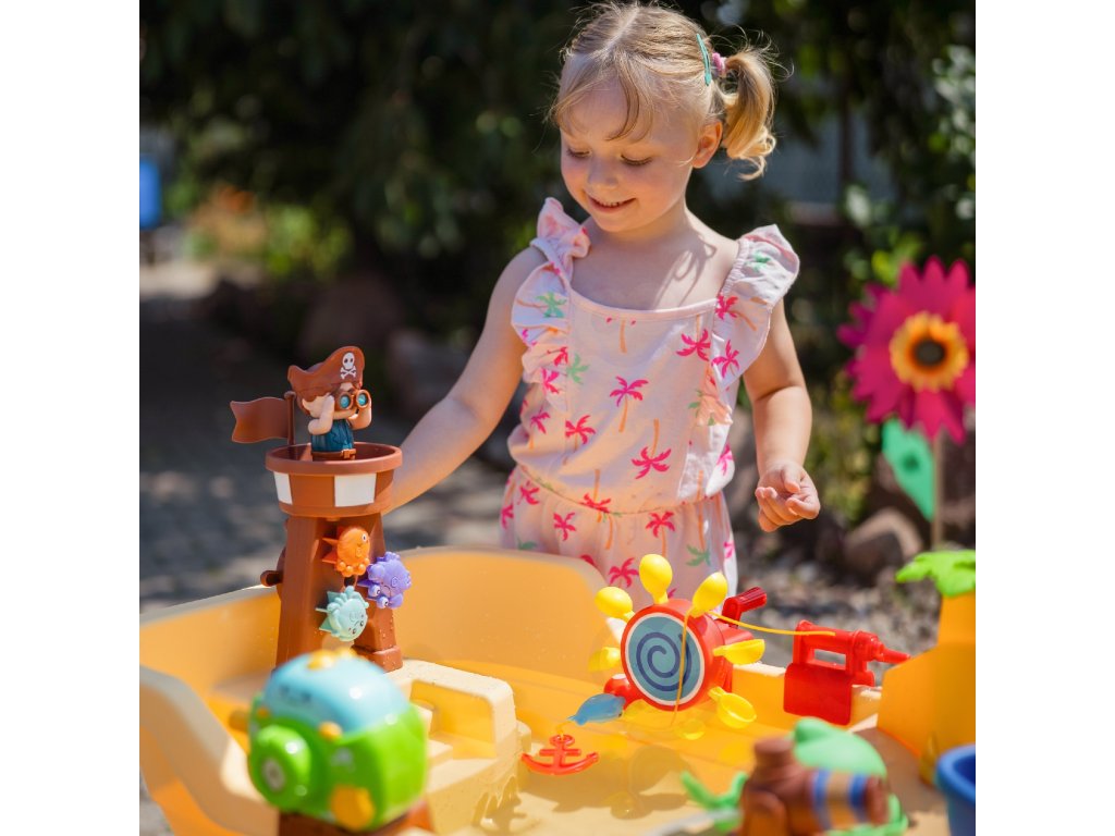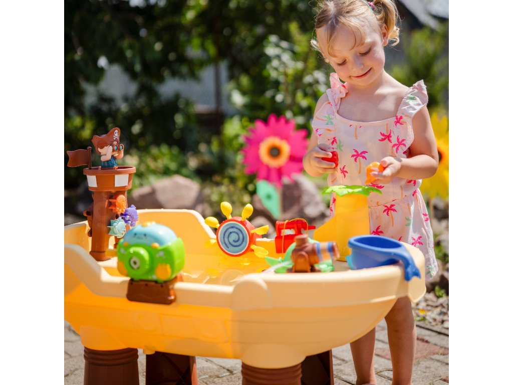 Vodný stôl s pirátskou loďou značkyWoopie je výnimočná hračka, ktorá deti zavedie do sveta pirátskych dobrodružstiev a poskytne im hodiny kreatívnej hry vonku. Vďaka rozsiahlej súprave farebných doplnkov, pohyblivých častí a pirátskej veže môžu batoľatá experimentovať s vodou, hrať sa s bublinami, otáčať vodným kolesom a objavovať množstvo herných možností. Vďaka jednoduchej, robustnej konštrukcii a veľkým rozmerom je stôl pohodlný a atraktívny aj pre niekoľko detí naraz.
