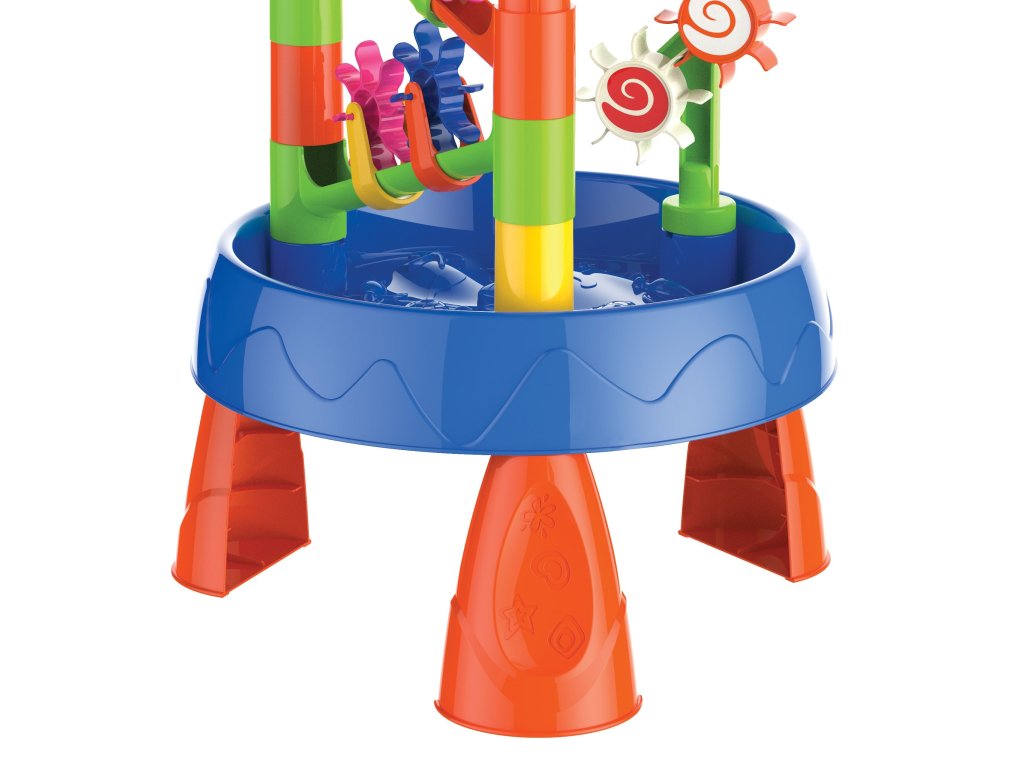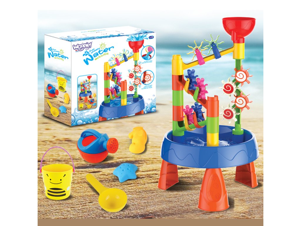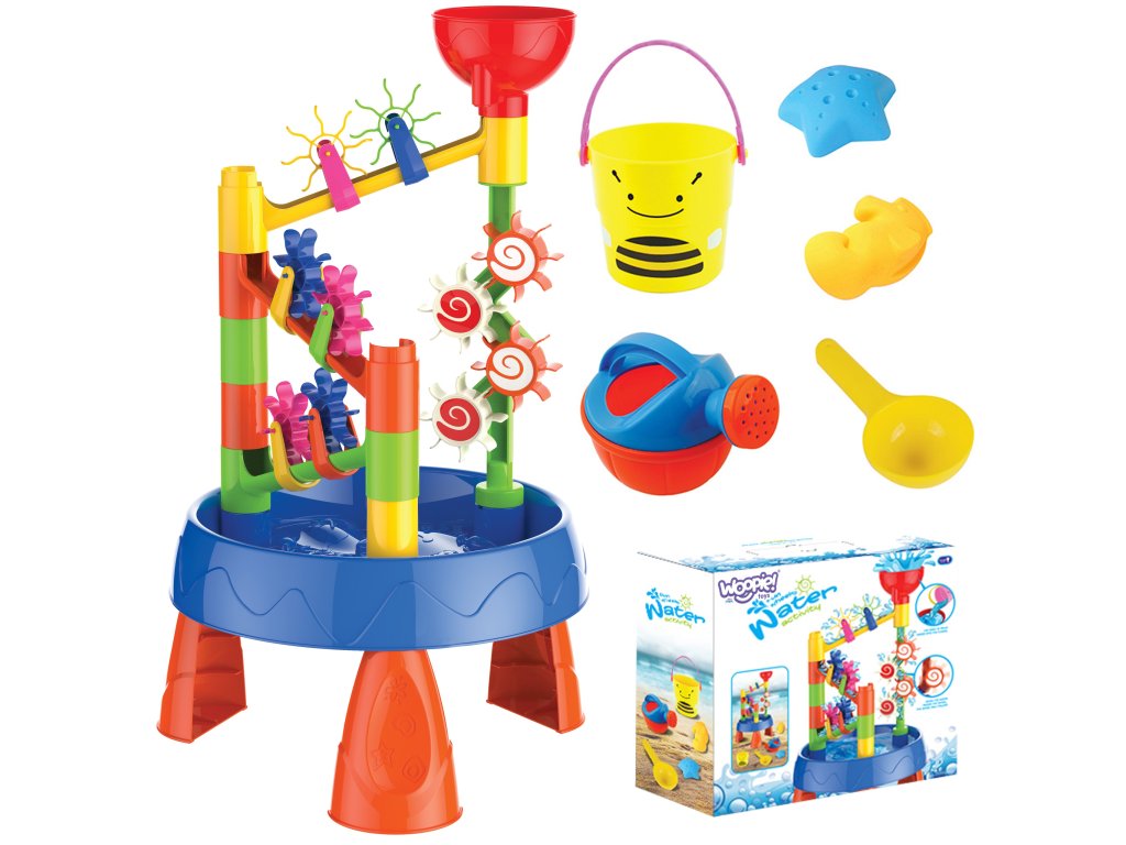 Vodný stôl 2v1 Pieskovisko od značkyWOOPIE je ideálnou hračkou na hranies vodou a pieskom. Súprava obsahuje5 príslušenstvo: formy, kanva, vedro, naberačka na vodu. Stôl máinteraktívne brúskyktoré sa otáčajú, keď sa do lievika naleje voda. Súprava je určená na hru v interiéri aj exteriéri. Ideálna na hranie vdoma a na pláži alebo v pieskovisku.