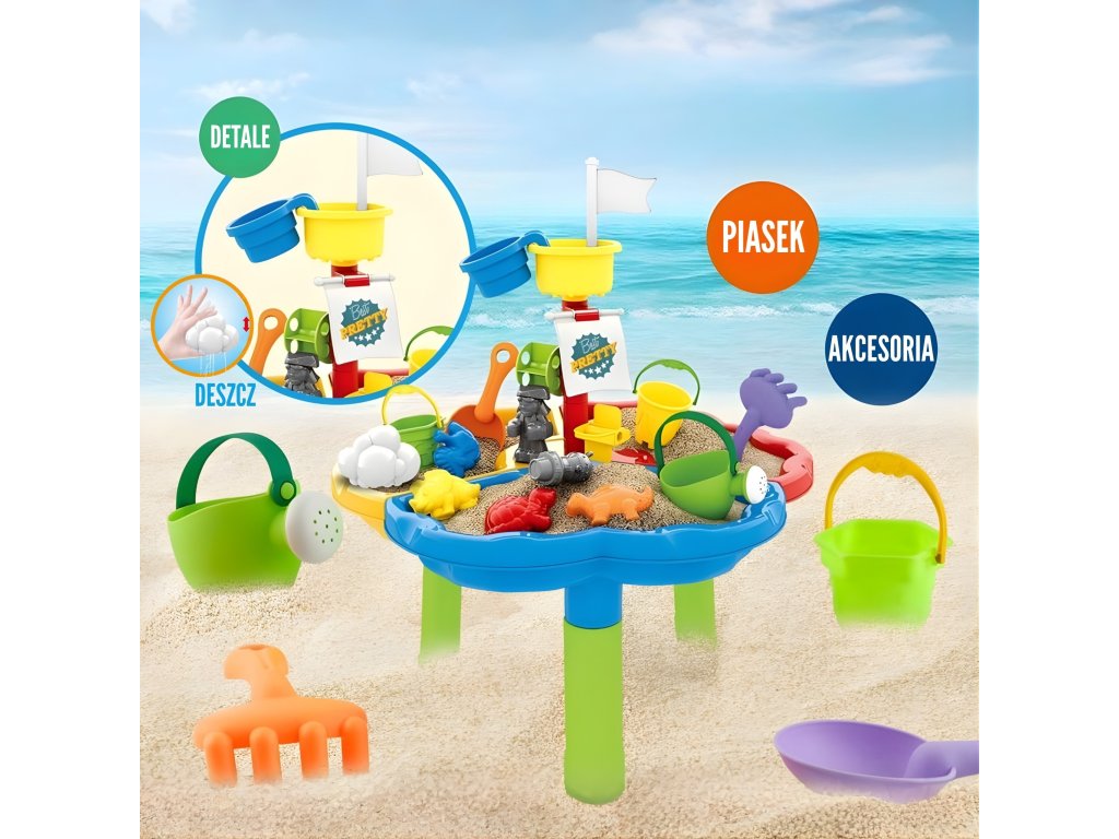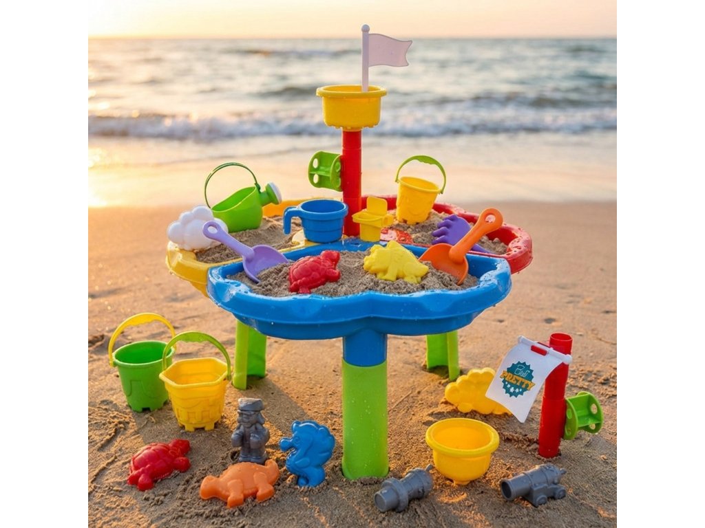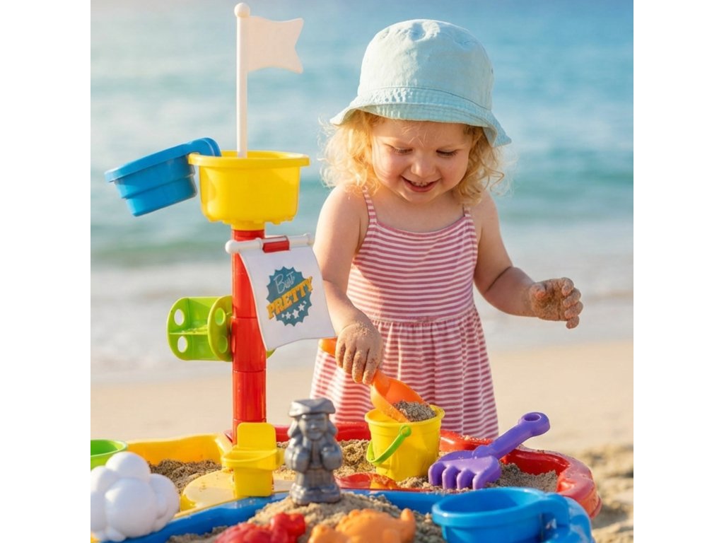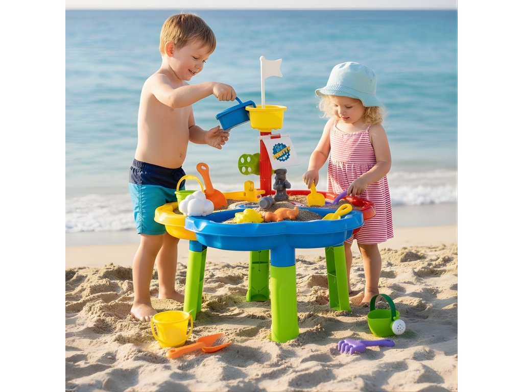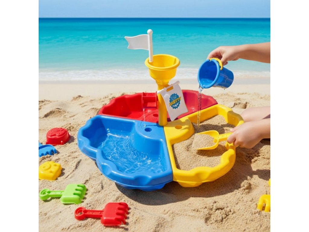 Tabuľka je rozdelená na tri časti - samostatne pre vodu, piesok a priestor na hranie. Ďalšie13 príslušenstvo pre ešte viac zábavy! Súprava je skvelá doma aj vonku - napríklad na pláži alebo v záhrade.