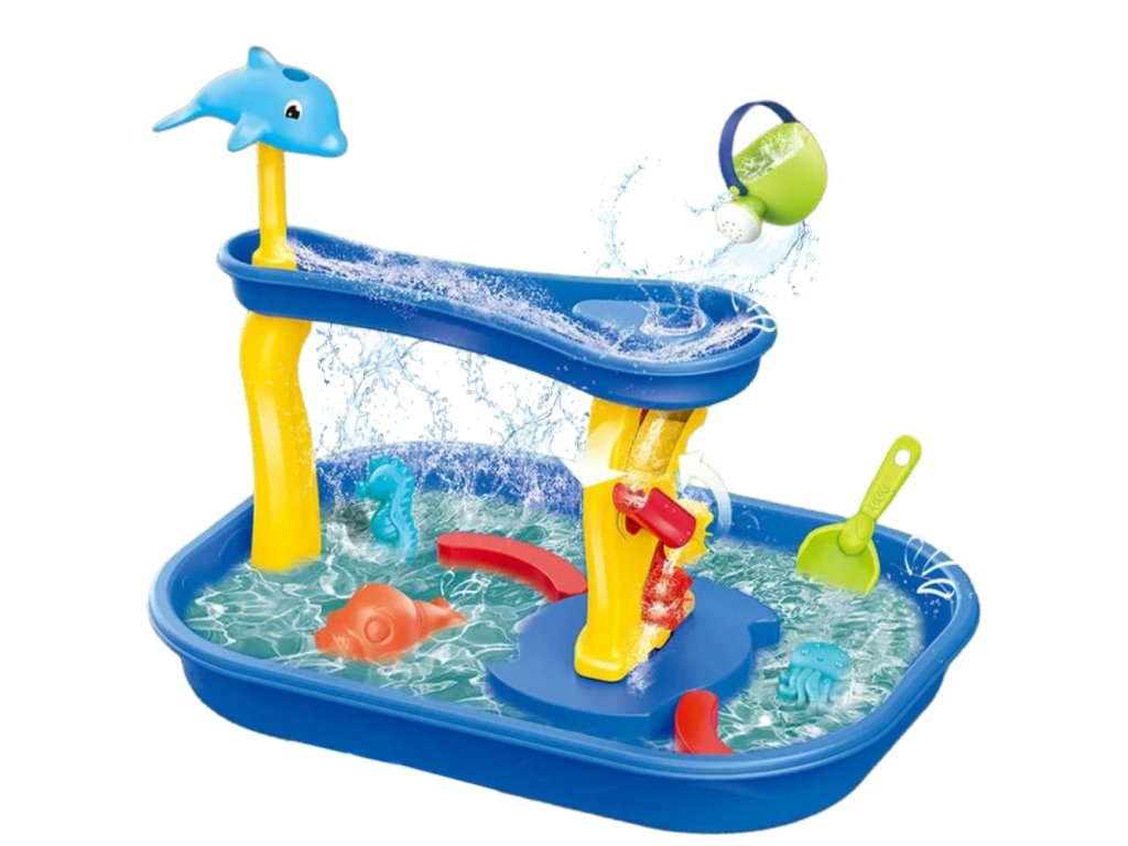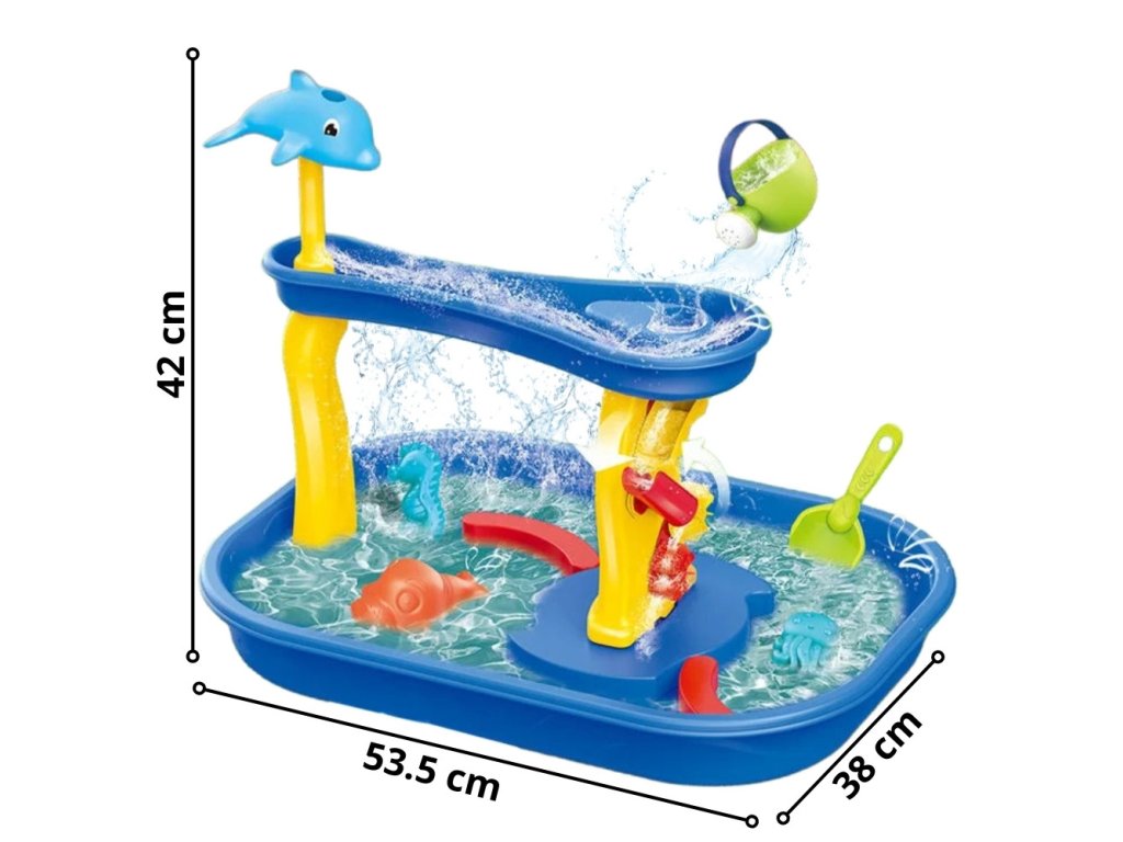 Vytvorte deťom jedinečnú hraciu zónu v záhrade alebo doma! Farebná hračka do vody 2 v 1 kombinuje zábavu pri chytaní rybičiek, vypúšťaní vody a sledovaní jej toku cez zábavné štruktúry, ako je vodné koleso a šmykľavka s delfínmi. Súprava poskytne deťom hodiny vzdelávacej zábavy plnej pohybu a smiechu!