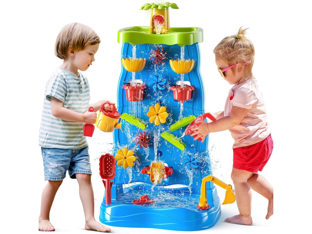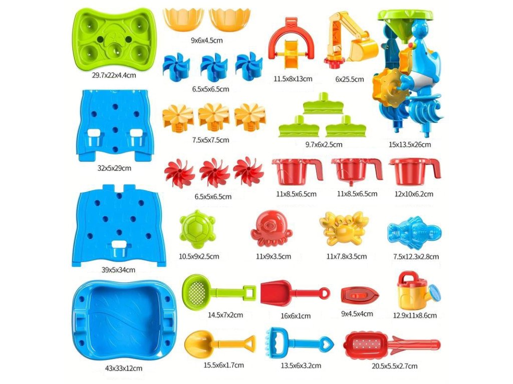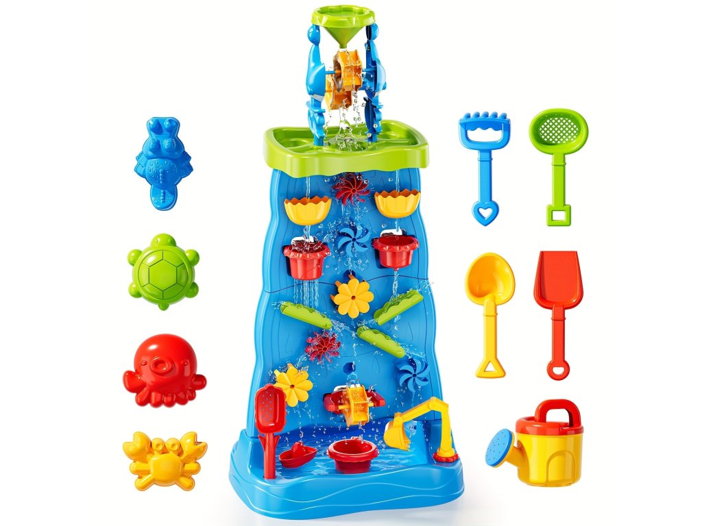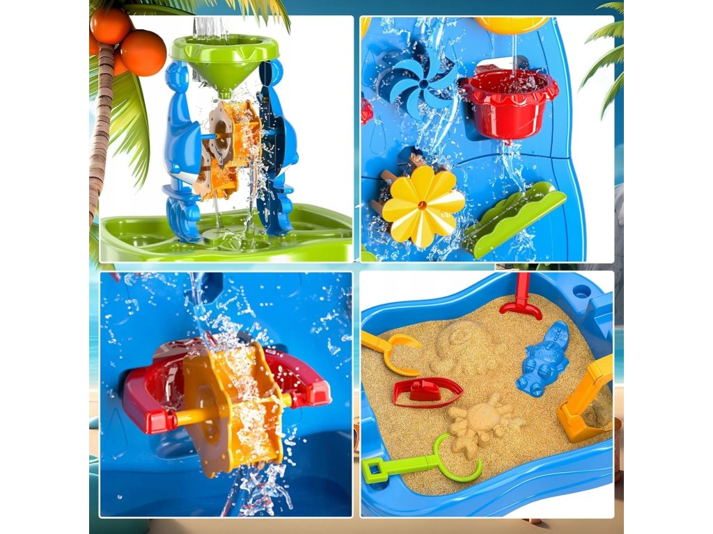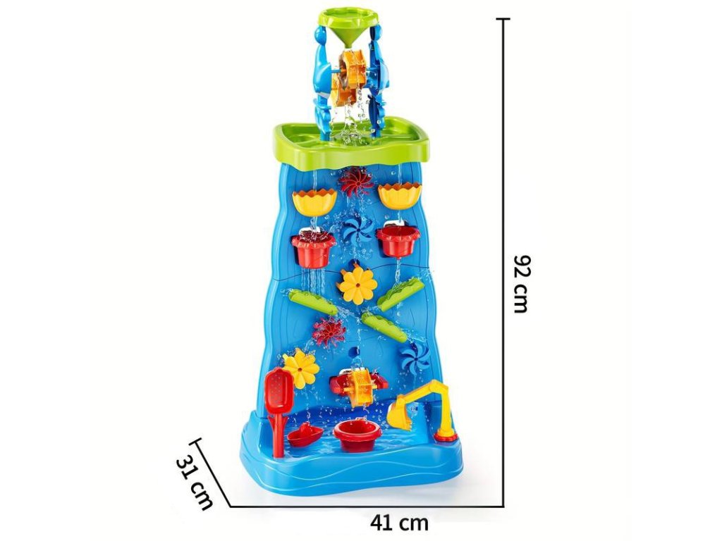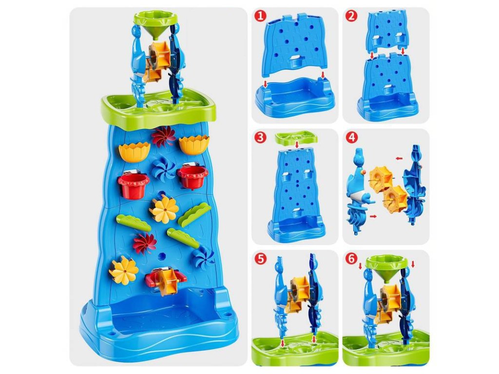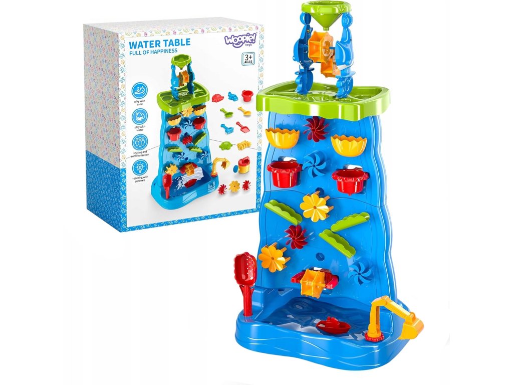 Vodný stôl Obojstranná vodná stena ZnačkaWoopie je jedinečná hračka, ktorá premení každú záhradu alebo pláž na miesto plné smiechu a kreatívnej hry. Vďaka množstvu farebných doplnkov, pohyblivých mlynčekov a nádob môžu deti experimentovať s vodou a pieskom a zároveň rozvíjať svoje manuálne zručnosti a predstavivosť. Vďaka jednoduchému dizajnu a veľkým rozmerom je hračka pohodlná a atraktívna aj pre viac detí naraz.