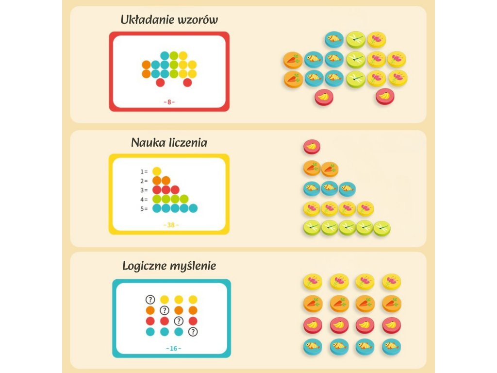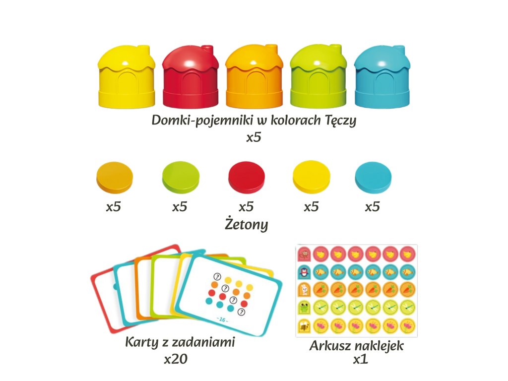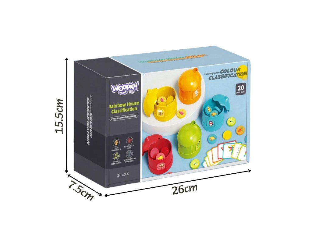 Zoznámte svoje dieťa so svetom logického myslenia a rozpoznávania farieb pomocou sadyLogická hra WOOPIE na klasifikáciu farieb! Táto vzdelávacia hra je ideálna pre detiod 3 rokov život. Súprava obsahujepäť farebných domčekov ižetóny s pôvabnými potlačami zvierat a predmetov a až do20 kariet s úlohami. Hlavným cieľom jezodpovedajúce tokeny do farebných domčekov, ktoré rozvíjajú rozpoznávanie farieb, logické myslenie a koordináciu rúk a očí. Domčeky majú tvar rozkošných postavičiek, ako je tučniak, včielka alebo opička, čo ešte viac podporuje hru. Je to skvelý spôsob, ako spojiť príjemné s užitočným, pripraviť vaše dieťatko na učenie matematiky a rozvíjať jeho schopnosti sústredenia.