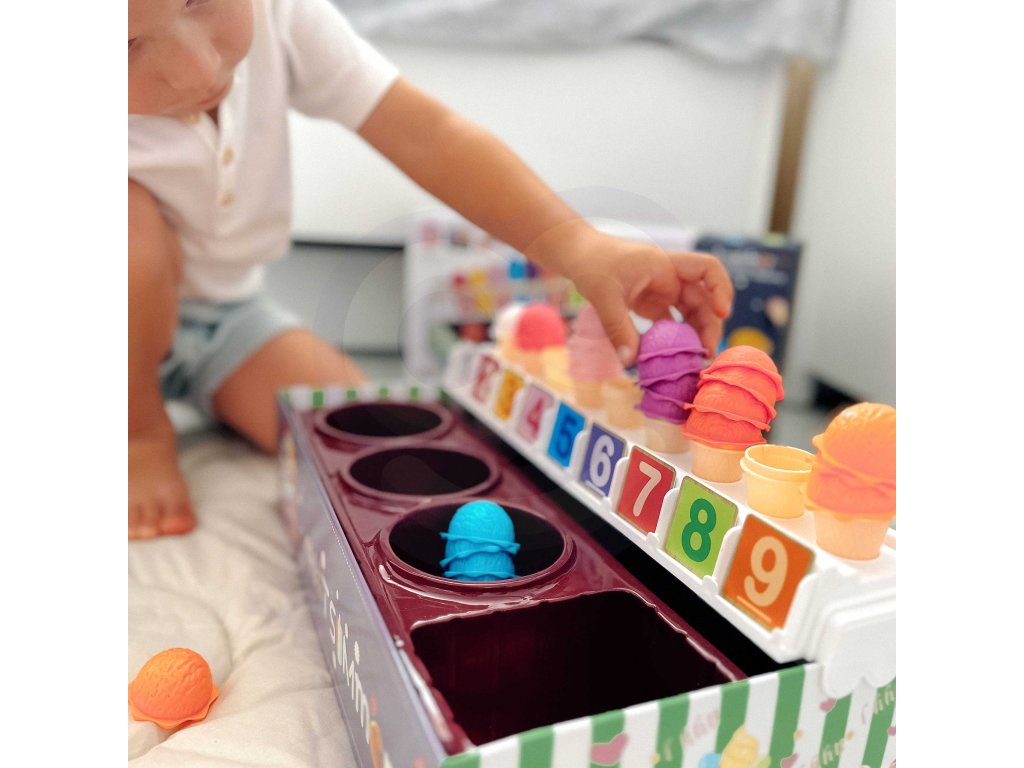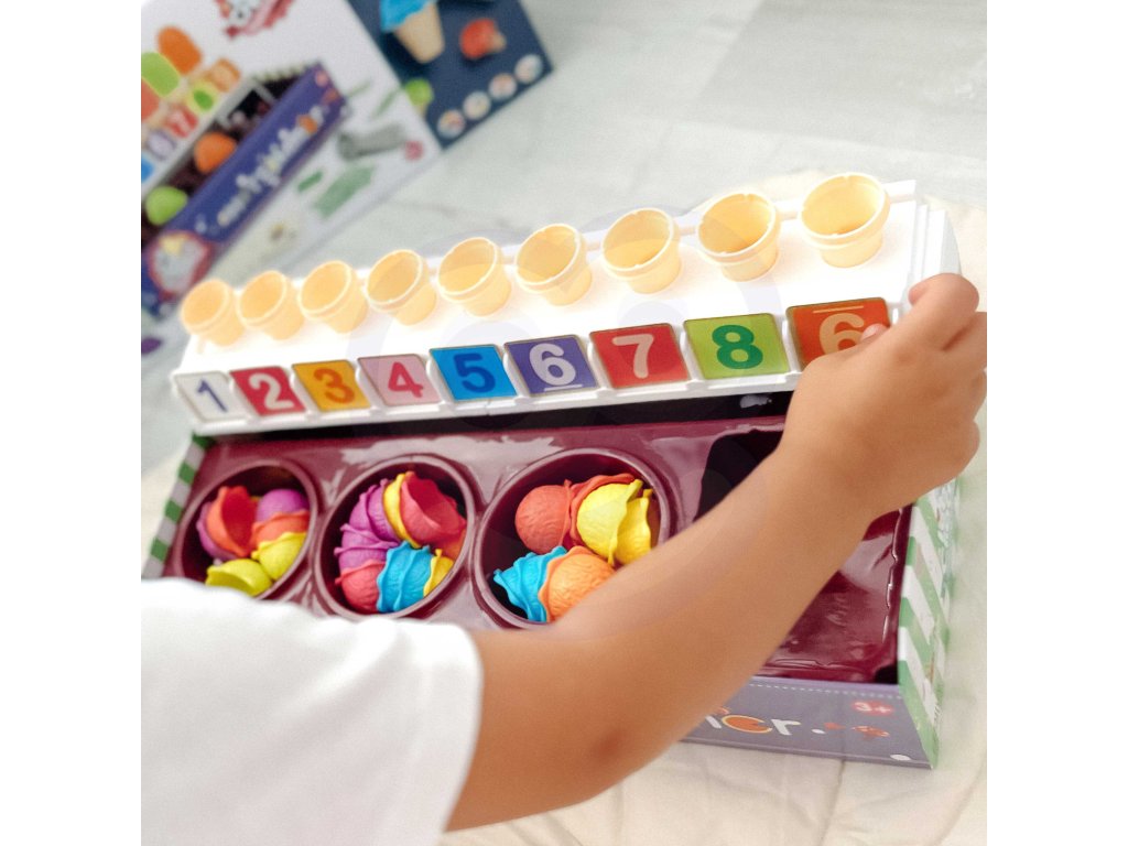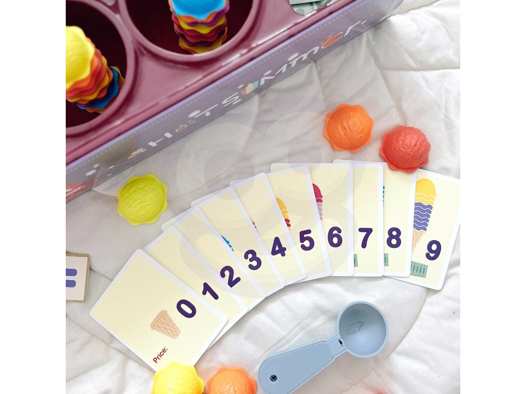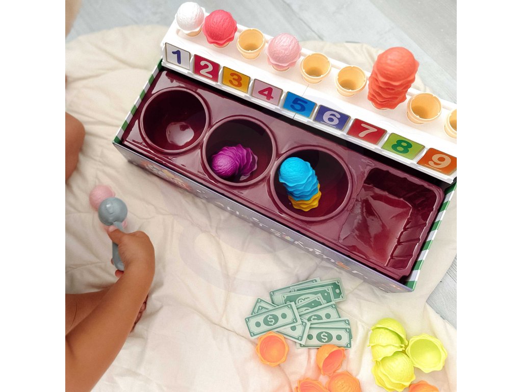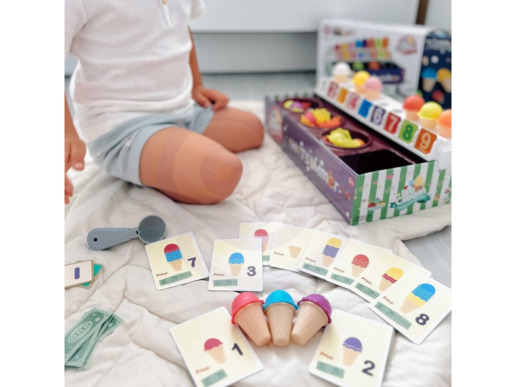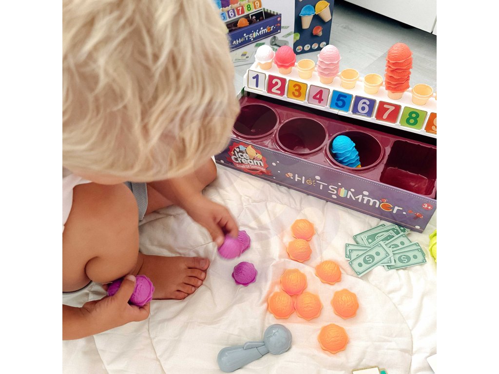 Zmrzlinový set od značkyWOOPIE vám umožní nielen hrať sa na malého predavača zmrzliny, ale ajna učenie počítania, čísel, farieb a sčítania. Súprava obsahuje87 prvkov, medzi ktorými nájdeme kopčeky zmrzliny, vafle, objednávkové karty, peniaze, žetóny s číslami a zmrzlinovú lyžicu. Počet kopčekov zmrzliny sa líši podľa farby a na objednávkových kartách nájdetejednoduché matematické úlohy. Naopak, prostredníctvom hrania rolí detirozvíjať svoje komunikačné zručnostipomôžu znížiť stres v každodenných situáciách a sú vynikajúcou lekciouempatia.