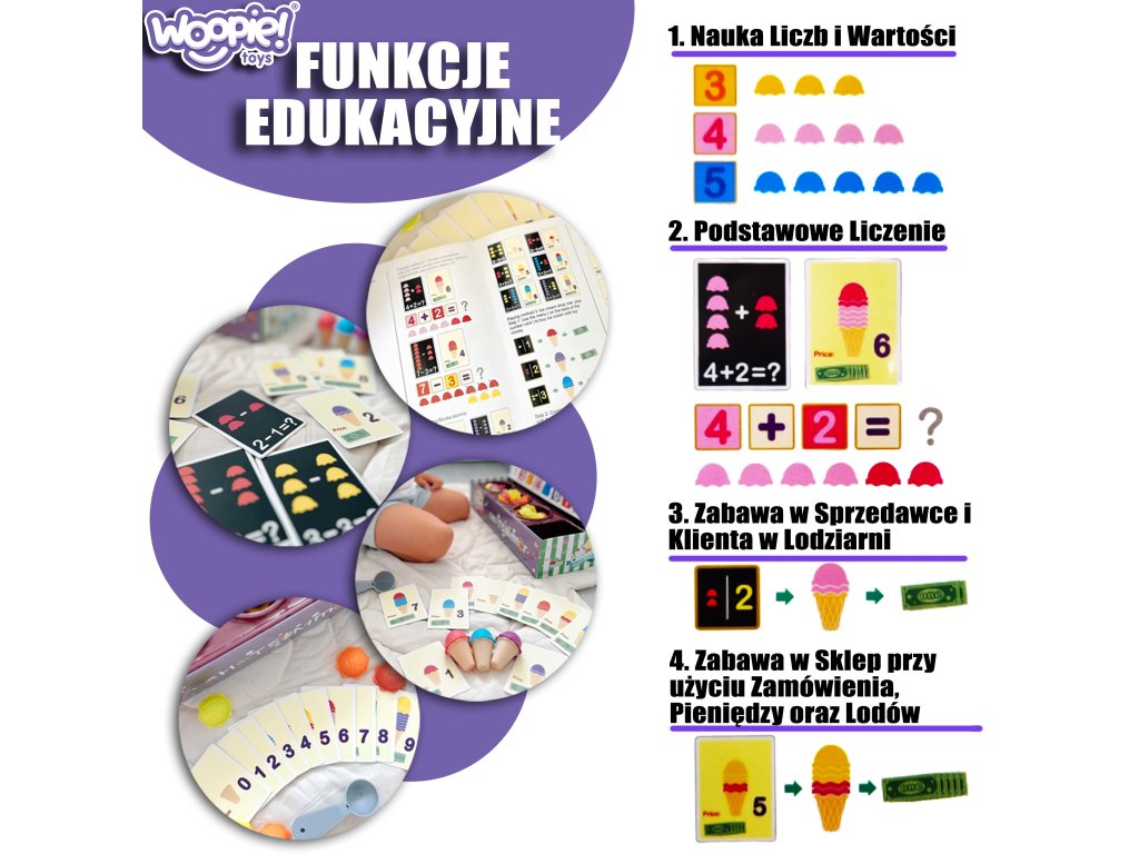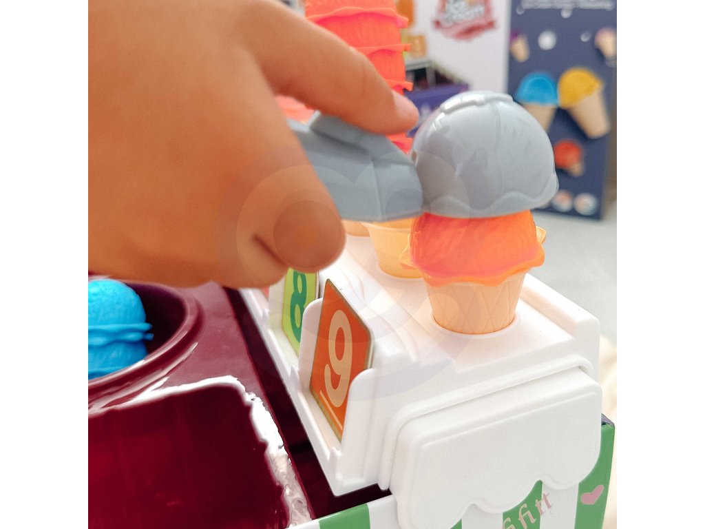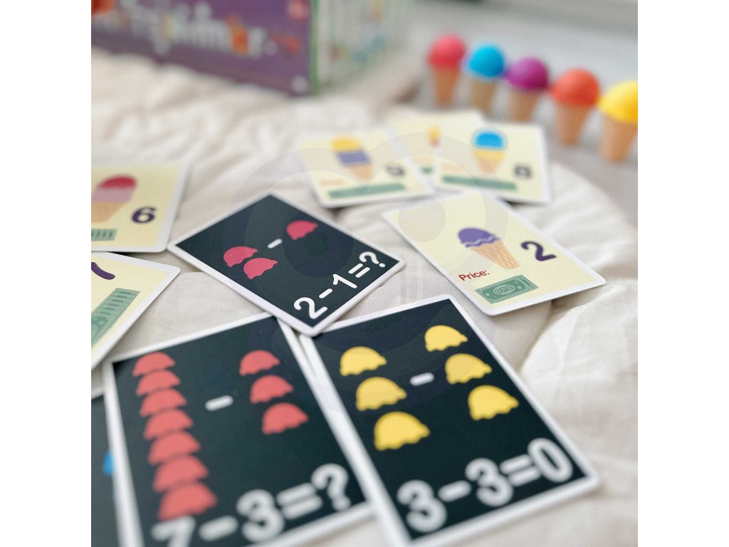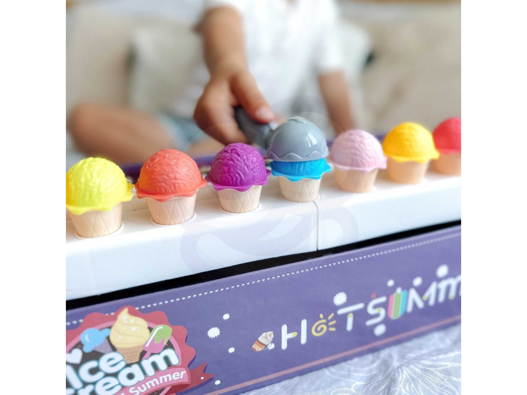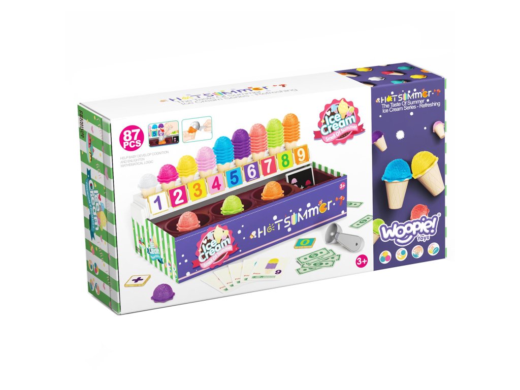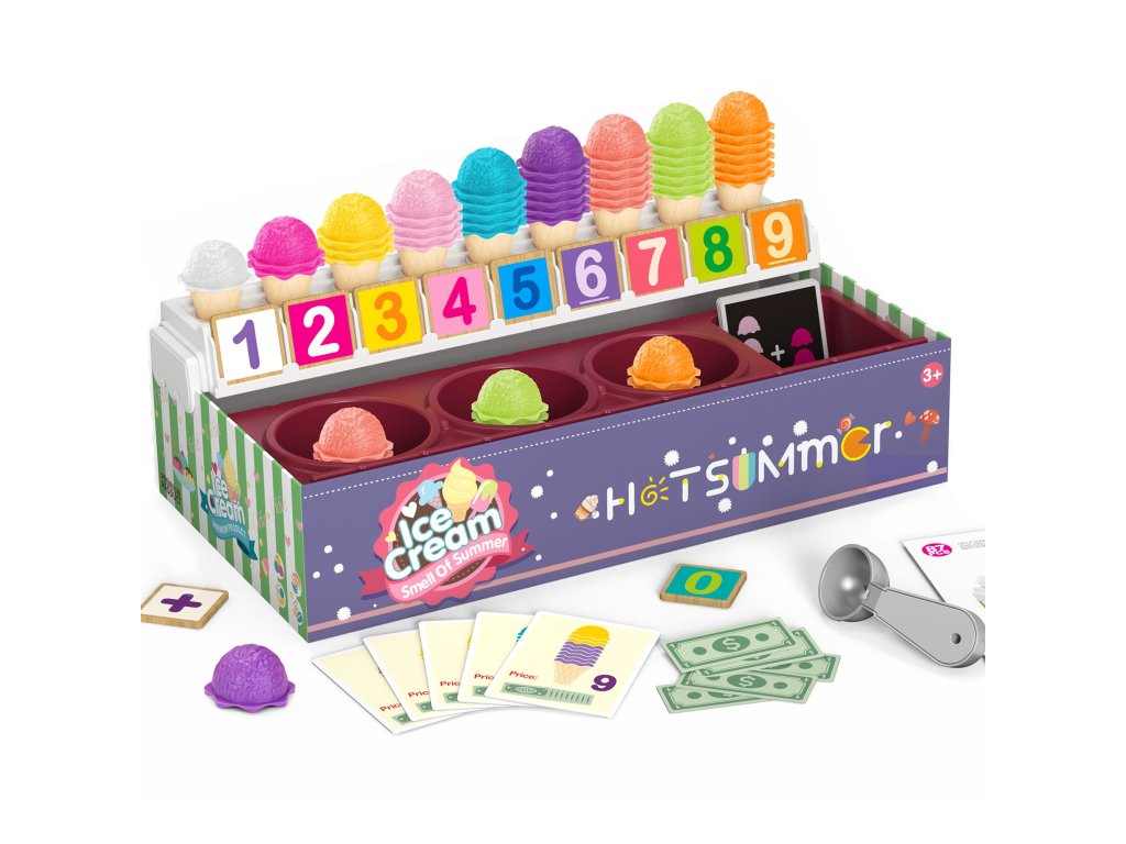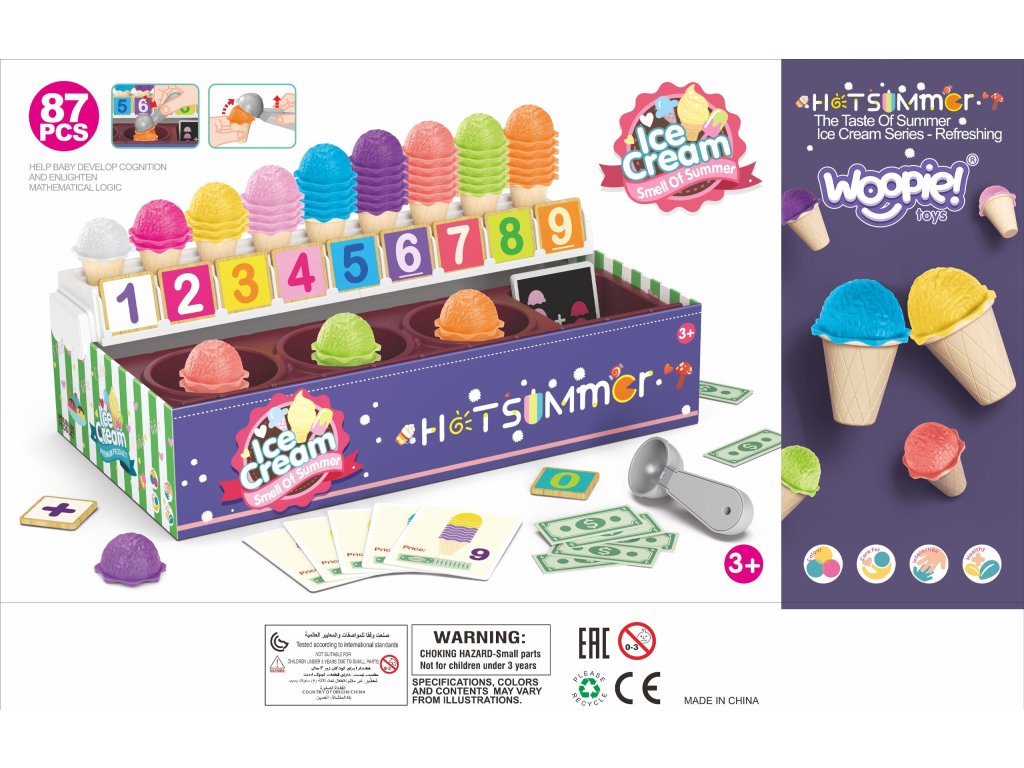 Zmrzlinový set od značkyWOOPIE vám umožní nielen hrať sa na malého predavača zmrzliny, ale ajna učenie počítania, čísel, farieb a sčítania. Súprava obsahuje87 prvkov, medzi ktorými nájdeme kopčeky zmrzliny, vafle, objednávkové karty, peniaze, žetóny s číslami a zmrzlinovú lyžicu. Počet kopčekov zmrzliny sa líši podľa farby a na objednávkových kartách nájdetejednoduché matematické úlohy. Naopak, prostredníctvom hrania rolí detirozvíjať svoje komunikačné zručnostipomôžu znížiť stres v každodenných situáciách a sú vynikajúcou lekciouempatia.