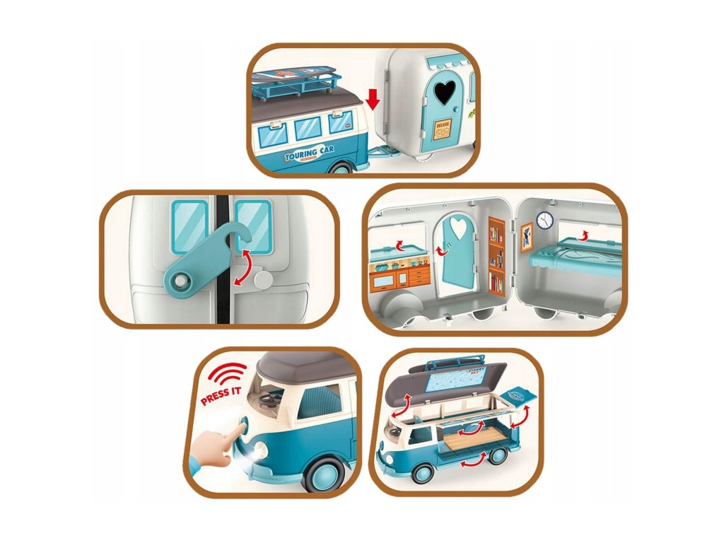 Otvorte si dvere do sveta neuveriteľných dobrodružstiev s jedinečným karavanom s prívesom od značkyWoopie! Táto farebná štýlová hračkaretro je ideálny pre malých objaviteľov, ktorí radikreatívna hra. Obytný automobil s prívesom je vybavenýotváracie prvky, realistický interiérasvetelné a zvukové efekty, ktoré urobia každú cestu nezabudnuteľnou. Toto je dokonalý nápad na darček, ktorý poteší každé dieťa!