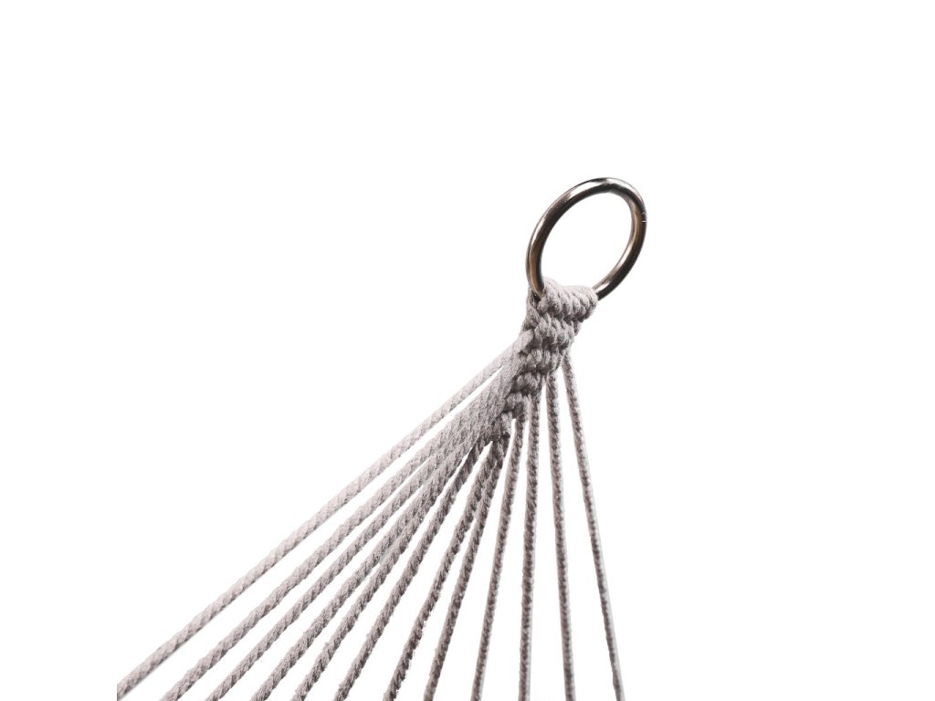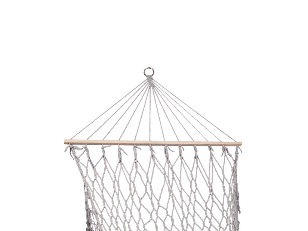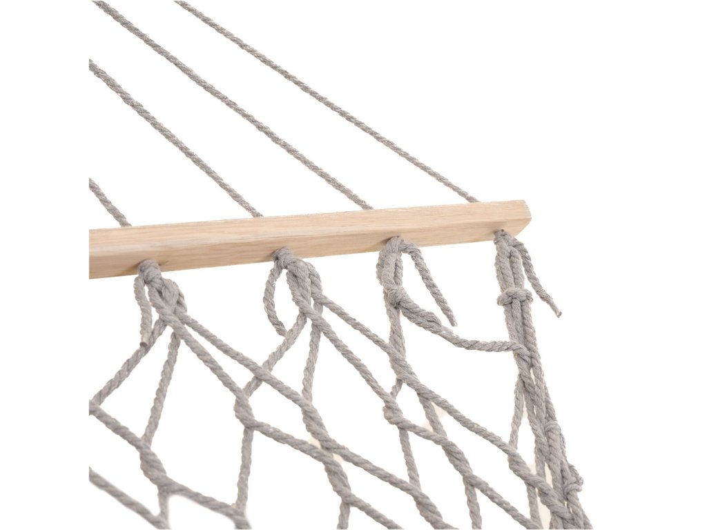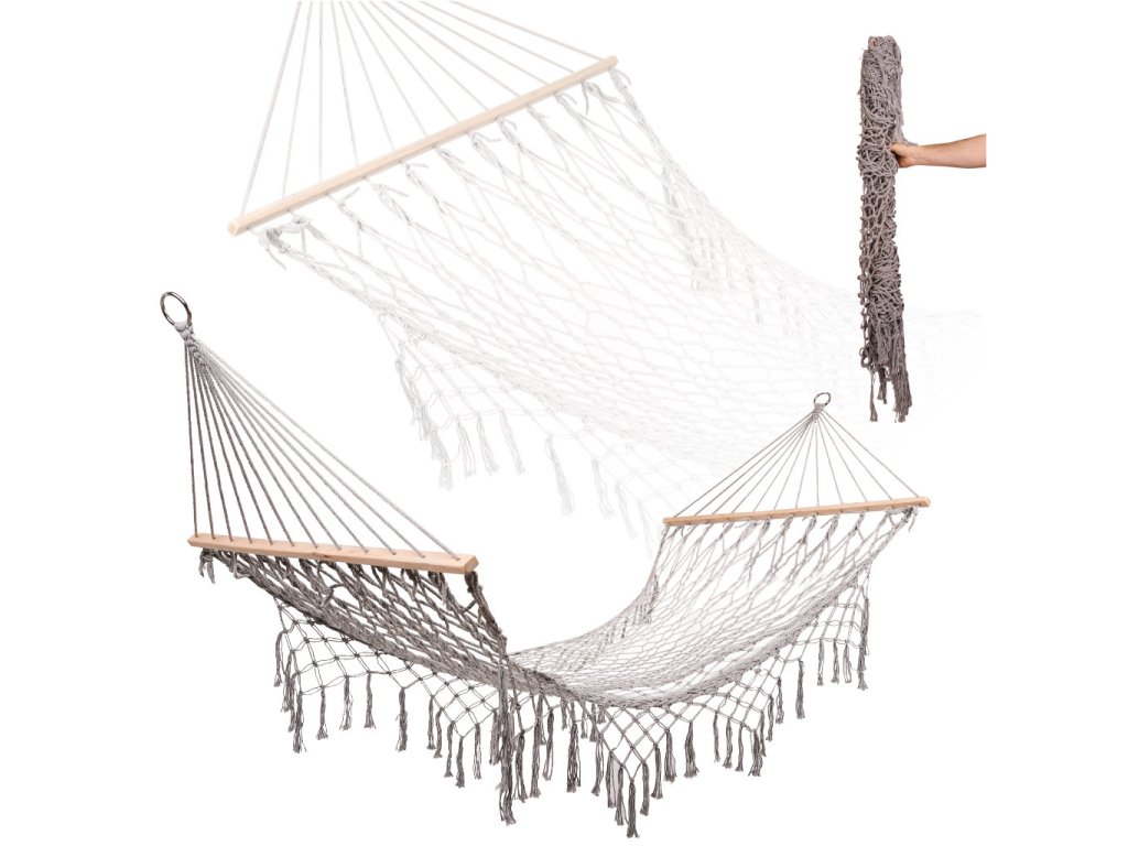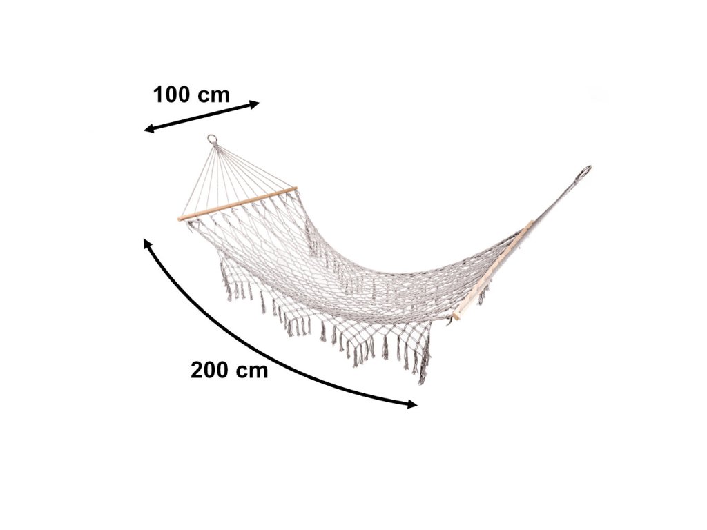 Hojdacia sieť je vyrobená z husto tkaných bavlnených lán (65 %), ktoré jej dodávajúvysokú odolnosť. Bez problémov unesie hmotnosť až 250 kilogramov. Svetlá béžová farba a strapce na okrajoch jej dodávajú elegantný vzhľad, ktorý sa dokonale hodí do každého záhradného prostredia. Hojdacia sieť je zavesená na 100 centimetrov širokom drevenom ráme, ktorý poskytuje dostatočnú stabilitu a pohodlie. Po zrolovaní zaberá veľmi málo miesta, takže sa ľahko skladuje.